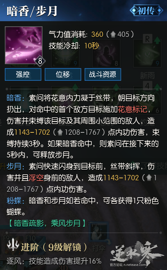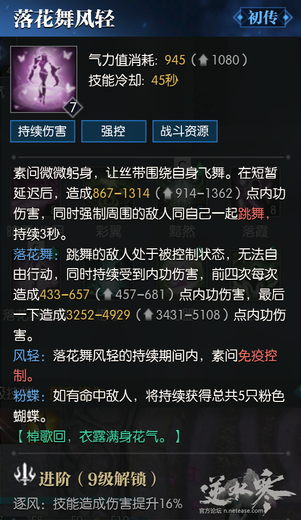 战场保命技能,被近战贴脸用这个技能保命,如果周围队友给力基本被控的近战也差不多走了。要是对面人多,别犹豫,黯然+二段跳跑路吧。团战时可以考虑二段找时机跳进人群,黯然+空雪+蝶恋花·惊梦+落花舞风轻控对手一圈。不过风险较高,容易一套没打完就躺地板。
