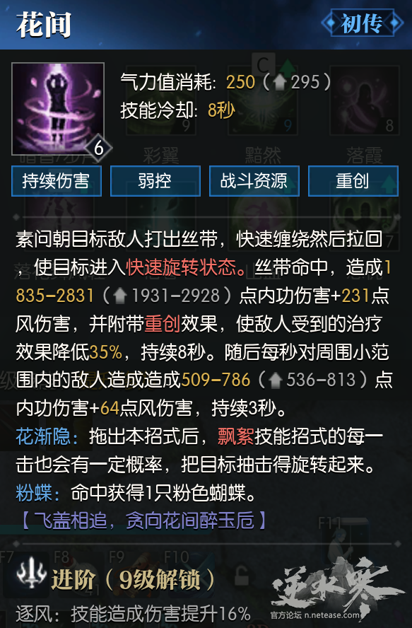 解读:该技能描述有问题。实测效果为治疗降低49%,带1级封脉效果(禁轻功,轻功回复停止),花间效果(减速并对周围人造成伤害)。