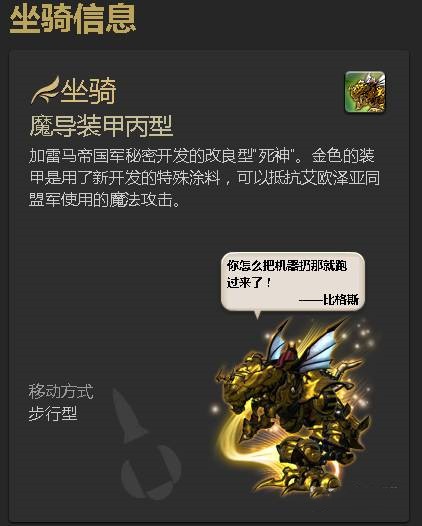 最终幻想14魔导装甲丙型兑换地点在乔纳森(格里达尼亚旧街 X:10.6 , Y:6.3)处,通过成就获得坐骑魔导装甲丙型,完成铭记不忘的队友,需要累计获得500次最优队员推荐。。