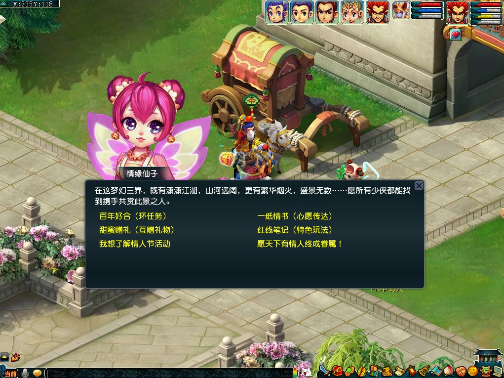 活动期间玩家(≥30级,至少3人组队)可在长安城(233,115)情缘仙子处领取任务。