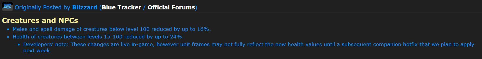 暴雪在7月28日的在线修正里削减了100级以下怪物的血量和攻击力。这也算是对7月27日暴雪魔兽世界游戏总监Ion Hazzikostas声明的快速响应。