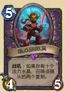 术士5费4/5随从,战吼,如果你有10颗法力水晶,召唤2个该随从的复制。5费3个4/5,或者说10费6个4/5,简直强的一逼,和二王子打combo那就是全部5/6了,这张卡无疑是新版本控制术的神卡,毕竟10费对于控制卡组是家常便饭,而10费以后,这卡就是稳定的3个4/5站场,根本想不到拒绝的理由。5费卡的身材价值12费,太逆天了,站场又稳。唯一缺点是它定义成5费,限制了偶数术的加强。