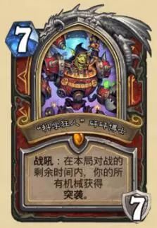 战士英雄,7费7甲,战吼,剩余时间内所有机械获得突袭。英雄技能为2费5种,每回合随机一种,且一定会改变。分别为:1.召唤3个1/1小机器人,绝逼机械。2.造成3点伤害。3.获得7点护甲。4.对所有敌方角色造成1点伤害。5.发现一个机械。不得不说这张卡很强,且不说护甲比其他英雄卡都高,单说这技能就一个比一个厉害。但也并非完美,缺点是只适合机械战,不然战吼发挥不出作用,并且因为英雄技能随机换,所以基本不要指望英雄技能解场,因为你根本控制不了他的变化。