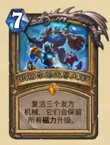 骑士传说法术,7费,复活3个友方机械,保留任何磁力升级效果。看效果就是要玩家开发机械磁力骑的节奏,但是绝不可能是一堆机械的套路,肯定是和当年亡者归来一样的,外挂几个磁力机械以确保复活稳定性,但是这个是传说,和亡者归来又不一样了,只能带一张。能不能用得看完所有磁力新卡才能知道。