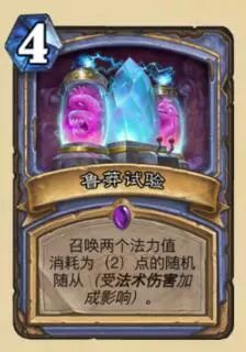 法师4费法术,召唤2个2费随机随从,吃法强BUFF,即有1法强就变成2个3费。这个就非常厉害了,每一点法强相当于赚2费,个人以为这张卡仅仅适合节奏法,配合血法使用或者4费召唤2个随从站场,毕竟有法强赚,没法强不亏,偶尔还能拿到米尔豪斯这种超模生物,总体上还是不错的。除非你能叫个末日,那么算你吊。