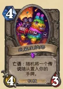 中立,4费4/3机械,亡语将一张随机传说随从加入手牌。站场身材亏了1费,而亡语也只是补一张随机传说随从(不包括法术),稳定性太差,给的传说能不能用不说,场面亏的节奏要怎么挽回才是最大的问题。除非配合鲁莽实验者1费入场,做任务同时还1费刷一张传说,那才可以勉强接受,否则真心没卵用,仅仅是好玩而已。