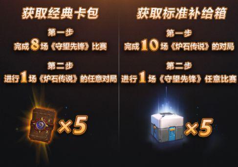 简单来说,在7月27日-8月6日,《守望先锋》与《炉石传说》展开限时联动活动。活动期间在守望先锋中完成8场比赛(仅限快速游戏、竞技比赛、街机先锋三大类),即可获得5包炉石传说经典卡牌包。当然,在炉石传说中完成10场标准对战模式对局(标准模式天梯,其他模式对局不计入),也可以获得5个守望先锋标准补给。
