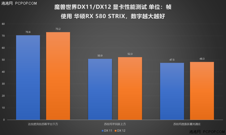 从测试的数据上来看,华硕RX 580 STRIX在这三个游戏场景中切换至DX 12后,游戏帧数有明显提升,虽然提升幅度不大,但相较N卡性能下降的表现,A卡在此次《魔兽世界 争霸艾泽拉斯》有1%-3%的小幅性能提升。