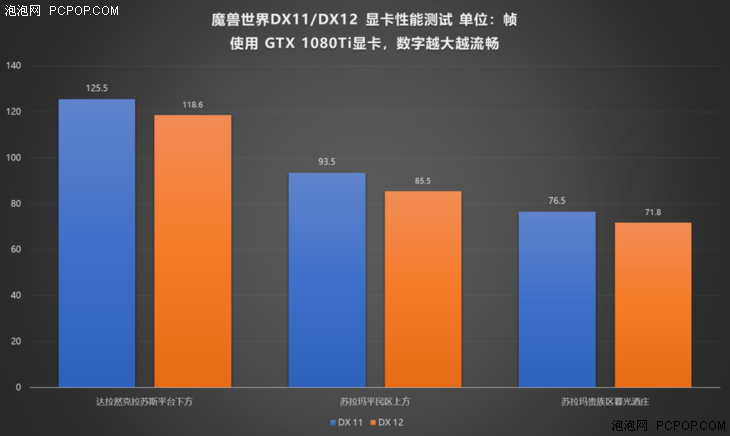 GTX 1080Ti在《魔兽世界》中从DX11切换为DX12后,性能出现明显损失,甚至无法维持原本的游戏帧数。但GTX 1080Ti的性能毕竟摆在那里,哪怕性能有所损失,依旧可以维持在60帧以上的基本帧数。在下一页我们会附上详细场景图片对比。
