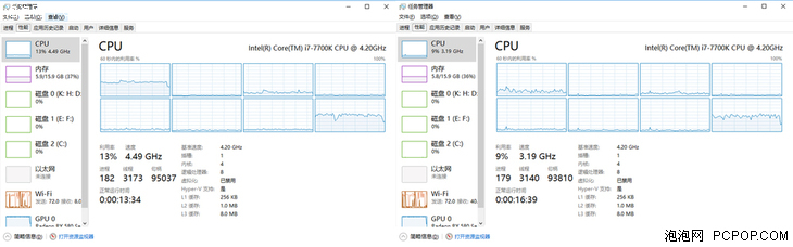 在N卡的测试环节中,我们发现,在《魔兽世界》体验过程中,从DX 11切换至DX 12后,CPU占有率有所下降,同时,处理器频率上升幅度明显。