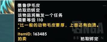 还有比如德鲁伊的毛皮,无疤的黑色鳞片等,会给你一个任务,完成了之后可以奖励艾泽里特。