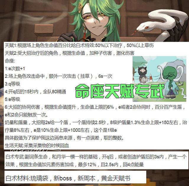 天赋1效果:50%血量以下加治疗,50%以上加伤害。天赋2效果:被白术奶的角色可提高自身的激化和绽放伤害。1命多e一次,2命提供额外攻击,3命提升q,4命加精通,5命提升e,6命根据生命值提升大招伤害,并百分百提供护盾。专武主要是生命副词条,根据生命值来提高自身伤害,每当Q技能生成一次护盾就能回复2.5能量。另外就是突破材料比较阴间,没想到又是分布在悬崖峭壁的琉璃袋。