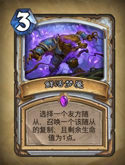 实验体:1费0/2,亡语将所有对实验体释放的法术回手,配合鲜活梦魇可以把buff牌变双份,斩杀线几何倍数增长,使用这张卡的时候要注意不要爆牌,算好手牌使用。