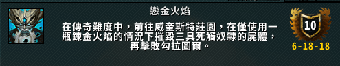 敘述有些拗口,就是拾取地上的鍊金火焰(小瓶子),一次燒掉三個小怪屍體即可。這個王的技能時間軸是每次復活之間會召喚兩隻小怪,通常打法是在復活前打死該輪小怪燒掉,做成就就是存怪一口氣燒掉。