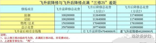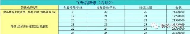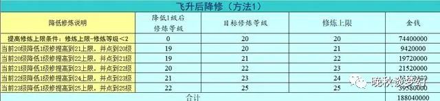 飞升后降修(方法2):降低1级修炼并点满到当前最高修炼原则。假设飞升后点到修炼20上限也是20,可选择降低1级修炼换取提高修炼上限的方法。然后把当前修炼点到当前最高的修炼,操作简单相比“方法1”贵3760000两。
