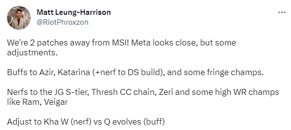 Riot Phroxzon:“我们离MSI就差两个版本了!版本已经确定得差不多了,但是内容还需要调整。加强沙皇以及卡特琳娜(对其神圣分裂者出装进行削弱),以及对一些边缘英雄进行加强。