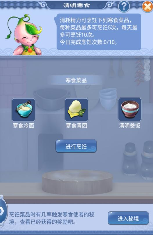 最后大家还可以参与和寒食节有关的活动——清明寒食,通过制作寒食菜品来触发秘境并获取奖励,每种寒食菜品最多可烹饪5次,各位少侠每天一共最多可烹饪10次,大家可要注意啦!