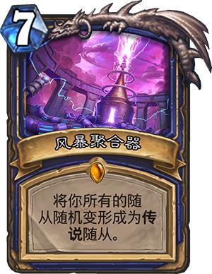 萨满的橙卡法术,效果是可以把所有随从随机变成传说随从。又是随机性非常强的一张娱乐性的卡牌,依赖一定的铺场,场面上有3个随从在就不亏。上限可以很高,下限也可以很低,非常不稳定,无法达到一些定向的目的。这张卡的效果可能是想说明剧情中"伊莱特克拉·风潮"的"风暴聚合器"非常厉害吧。你说这张卡为什么是橙卡?因为他可以把别人变成橙卡。