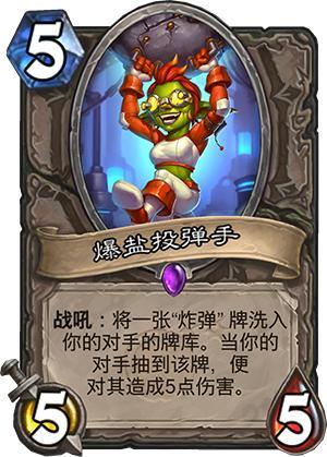 看到这张卡的特效,广大玩家们是不是很熟悉呢?没错,这张卡就是"钢铁战蝎"的"劣制复刻版"。"钢铁战蝎"是6费橙卡,"爆盐投弹手"是5费紫卡,这样一看,"爆盐投弹手"的效果还是可以接受的。虽说是炒冷饭的卡,但是每次看到这样的特效,都会觉得很有趣。