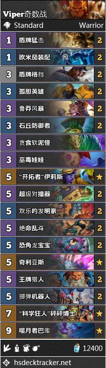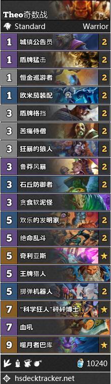 迄今为止所有成功的战士卡组都是偏向控制的,有些组件已经被证明是最优的选择。奇数战看起来是这个版本最有前途的卡组,如果环境能进一步降低蓝龙德和换家德的出场率,那么他的表现还能继续提升。我们能够看到奇数战有两种主要的思路:一种偏向快速和过牌,更针对快攻卡组。Theo的构筑是一个典型的例子,带上了城镇报警员和苦痛。第二种思路是偏向快速,没有过牌,主要试图靠疲劳耗死慢速卡组。Viper的构筑体现的正是这种思路,他不仅没有过牌,还带了伊利斯和恐角来往牌库里塞牌。正所谓叠最厚的甲,挨最毒的打。