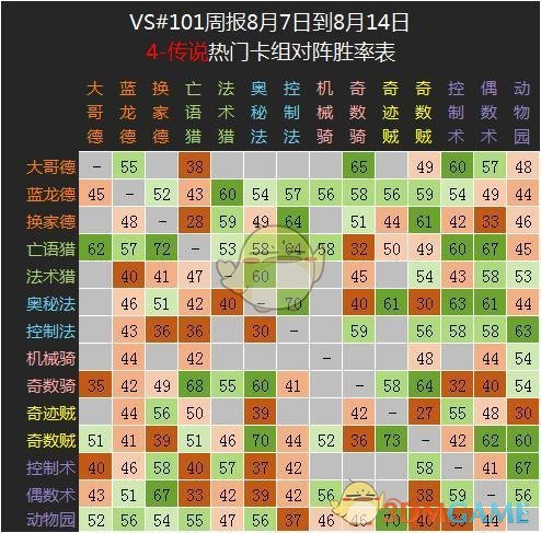 第101期vS强度排序是基于上周各卡组在天梯对阵胜率以及对阵频率所统计出的期望胜率而得出的。
