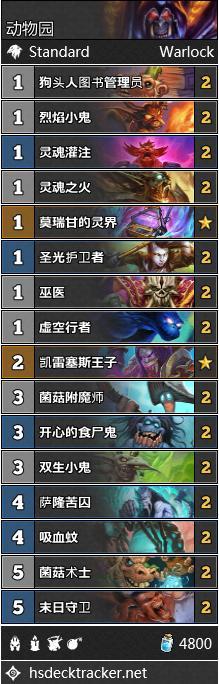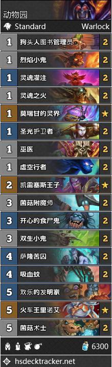 动物园是天梯中最热门的卡组,并且在版本初期一度定义了环境。灵魂融合,双生小鬼和治疗组件给予了动物园在早期快速展开的能力,再加上灵魂视界提供的廉价抽牌,动物园简直势不可挡。这个牌组可以比其他牌组更快的铺场,其滚雪球的能力也无可匹敌。确实,在其他职业眼中的“超展开”,对动物园来说不过是家常便饭。