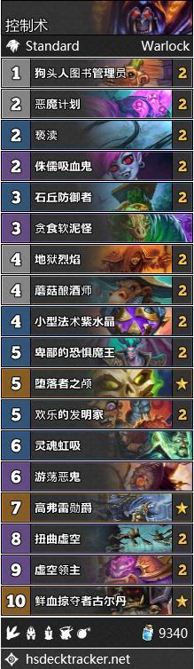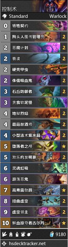 除了上述的强力形态,控制术也回到了人们的视野。恶魔计划可以有效的反制某些OTK卡组,破坏他们的combo,从而克服了控制术一直以来的最大短板。术士又一次可以依赖虚空领主和各种AOE法术来碾碎他们的敌人。林恩曾经是控制术的头牌,不过如今很多构筑已经放弃了林恩,因为她在当前环境中生效过慢。首先你不应该来得及开完封印,其次由于不带黑暗契约,林恩也很容易被呱羊或者沉默。恶鬼和吸血鬼从疲劳和反制OTK的角度来说也是更好的选择。基于我们的观察,卑鄙的恐惧魔王是一个不错但却容易被忽视的选择。这张牌不仅可以解场,还增强了DK的复活池。同时他也可以拿来应对欢乐的发明家。