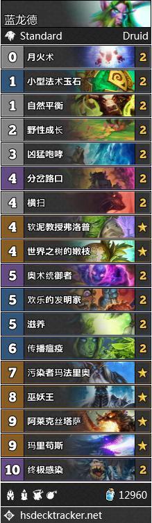 我们先从蓝龙德开始,这是动物园之后第二个定义环境的卡组。玩家们对这个卡组做出了很多尝试,在起初这带来了胜率的略微下降。不过,看起来蓝龙德已经找到了出路,开始逐步显现他的力量,这在高分段尤其明显。很多玩家都用蓝龙德打到了传说高位,而且我们搬运的这个构筑远远好于其他的变种。欢乐的发明家显然非常强力,他的加入很快拉高了这个卡组的胜率。生物计划被证明是一个大坑…应该被舍弃。橙武看起来是比梦境花栽种师更好的OTK组件,尤其考虑到恶魔计划的普及,而养花需要把关键随从捏在手里。在与换家德内战中,橙武也比梦境花栽种师更好。最后,诸如三王子,激活,灵力瓜这样的组件也因为过贪而不应该被选择。