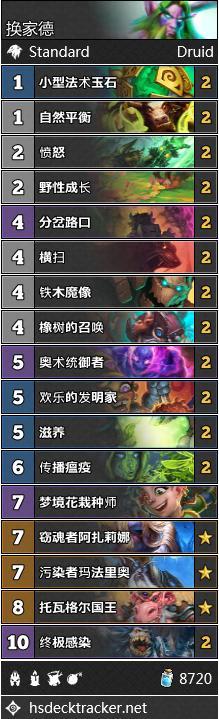 小德正如预料的那样,在砰砰计划的初期成为了有力的竞争者,只是由于术士的普及才逐渐衰落。在砰砰计划首周,蓝龙德和换家德这两大OTK卡组对环境造成了巨大的影响。不过也别忽视其他的德鲁伊卡组,正如女巫版本一样,这个职业整体都非常强势。