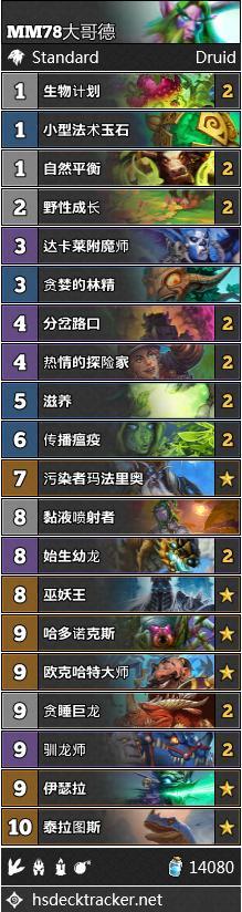 尽管蓝龙德和换家德获得了更多的关注,其他强力的德鲁伊形态也不应该被忽视。MM78用大哥德打到了传说第2.因为比起其他形态来说,大哥德更专注于跳费,因为这是唯一一种能够让生物计划利大于弊的形态,特别是和热情探险家一起使用的时候。黏液喷射者在这个卡组中也有惊异的表现,可以拿来复制大师,驯龙者,大蜘蛛,大表哥等等强力随从。