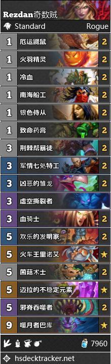 奇数贼在早期环境中已经取得了巨大的成功,主要是能够克制动物园,偶数术,以及惩罚那些尚未完全优化的新卡组。迈拉的不稳定元素可以帮助在一些逆境中翻盘,并且往往能在下一回合造成斩杀。欢乐的发明家轻易的替代了其他的5费随从,虽然蓝龙人也很不错,但是吵吵墙总是更好,而且可以和菌菇术士更好的配合。Rezdan利用一套根据环境优化的构筑打到了传说第3。血骑士不仅可以反制对面的吵吵,还可以跟自己的吵吵配合来对慢速卡组造成威胁。雏龙取代闪狐是针对环境做出的改变,用来更好的应对小德和慢速术士。如果环境中快攻较多,那么选择闪狐会比较好。