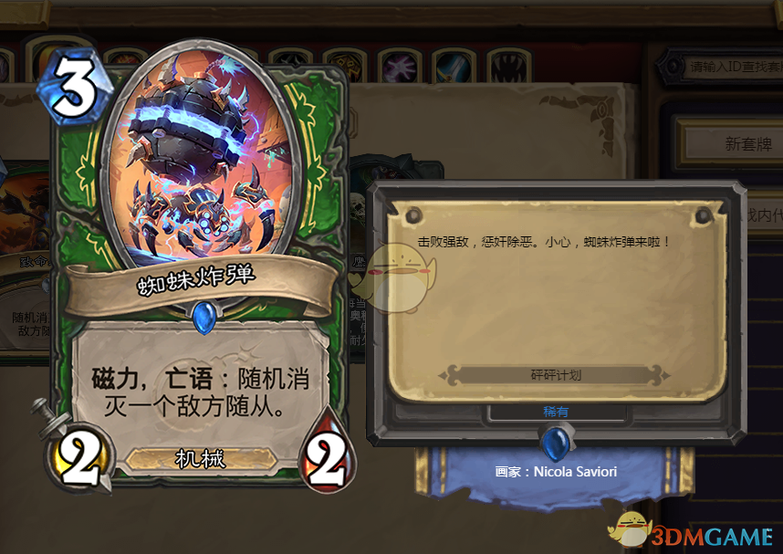 这套牌的核心就在于毒箭机器人和蜘蛛炸弹这两张牌,老玩家应该都知道这两牌是游戏前期的节奏控制器吧,它们再配合可升级机器人和315嘲讽站住场面后,那么这场游戏就差不多赢了。特别值得我们注意的是,蜘蛛炸弹还可以和亡语体系产生联动,显得非常灵活,这一点也是“机械冬临猎“的创造性所在。蜘蛛的剧毒属性能够一圈一个随从,再配合触发亡语的牌,那么这个就能直接干掉对面的“小朋友”随从,而且费用不高,这就显得非常灵活,差不多五六个回合之后,我们再把冬临狮子压上去,对面一看这个形势,不是投了就是等着失败,除非它有更与众不同的打法来应对。