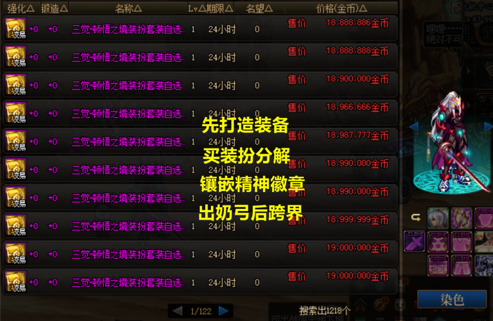 为防止徽章价格上涨,可以先买三觉装扮,分解获取精神。提前打造装备,缪斯推出后跨界过去,但可惜白金徽章不行。新职业还没出,缪斯的白金徽章,这是弄不到的。