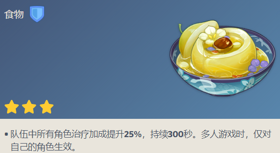 队伍中所有角色治疗加成提升25%,持续300秒。多人游戏时,仅对自己的角色生效。