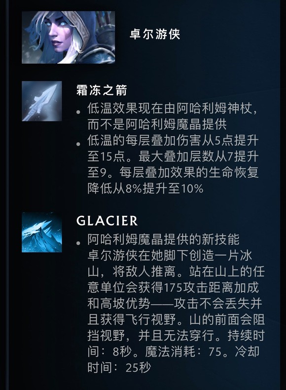 卓尔游侠在她脚下创造一片冰山,将敌人推离。站在山上的任意单位会获得175攻击距离加成和高坡优势——攻击不会丢失并且获得飞行视野。山的前面会阻挡视野,并且无法穿行。持续时间:8秒。魔法消耗:75。冷却时间:25秒