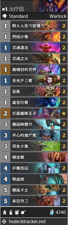 从最开始的治疗园横扫新环境,胜率登顶,到现在职业胜率虽回落第二,但多套卡组都开始各有表现,术士无疑是这个版本的赢家。治疗园是上个版本中后期开始出现的一套优秀的快攻卡组。新版本在得到莫瑞甘的灵界、灵魂关注和双生小鬼后如虎添翼,迅速成为了动荡环境里快速上分的首选。二王子起手的治疗园,甚至可以活生生地用质量压死很多中慢速卡组,颇有种当年恶毒德称雄时的感觉。随着环境稳定和其他卡组的针对,治疗园的胜率比初期有所下降,但仍是快攻里的佼佼者。