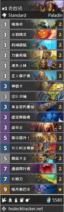 版本初期尝试新卡的热乎劲过去后,大家都发现奇数骑仍然是上分利器,只是玩起来实在无趣。加入机械体系的奇数骑,强度也大致如前,构筑稳定后,带上了机械袋鼠、欢乐的发明家、格洛顿。由于全天梯都带上了627和521,奇数骑的环境强度有所下降,也同时加入血骑士来针对。但仍然是一套非常强力的套牌。