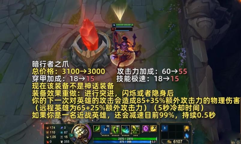 装备效果重做:进行突进、闪烁或者隐身后,你的下一次对英雄的攻击会造成85+35%额外攻击力的物理伤害(远程英雄为65+25%额外攻击力)(5秒冷却时间)