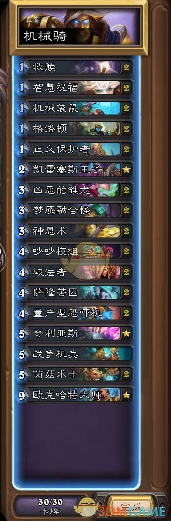 经过大家的改进,这套卡组的构筑已经成熟了,欢迎大家偷偷上一波分,卡组名字我都想好了,这套卡组以机械为核心,本身我们又是骑士,其疾如风,就叫“疾风骑吧” 当然也是因为我的id有个风字嘛