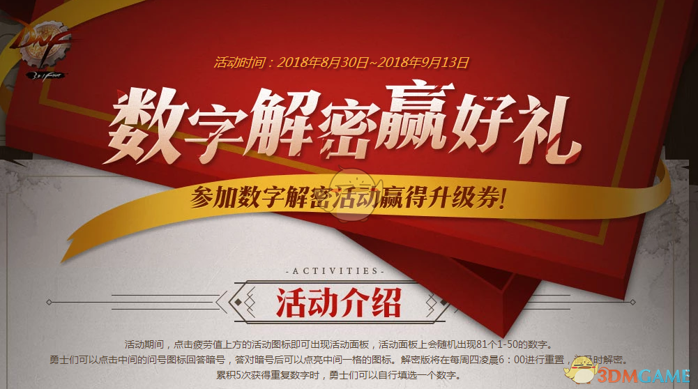 2018DNF数字解密活动即将在8月31日来临,又到了考验大家脑力的时候呢,小伙伴们是不是非常期待。玩家可以通过该活动获得奖励丰厚的解密礼盒,每一天都会有新的答案公布。下面小编就为大家带来一篇DNF数字解密活动答案汇总,一起来看看吧。