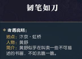 逆水寒ol有很多地方有有趣的奇遇,不知道小伙伴们做了多少呢下面分享一个很有趣的奇遇,大家一起做做看吧,相比前面的,就简单的多了。下面和小编一起来看下今天的奇遇“韧笔如刀”