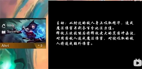 主动:从附近的敌人身上吸取精华,造成魔法伤害并剥夺百分比法力值。释放三次技能后将释放更大的范围冲击波,对周围敌人造成魔法伤害,对被吸取的敌人将造成额外伤害。
