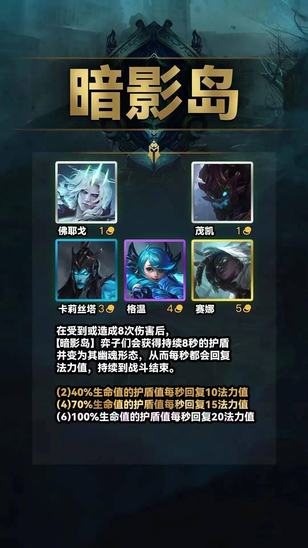 在造成或受到伤害合计8次,暗影岛英雄会获得40/70/100%生命值的护盾,持续8秒,并且会在剩余的时间内每秒获得5/12/20法力值。