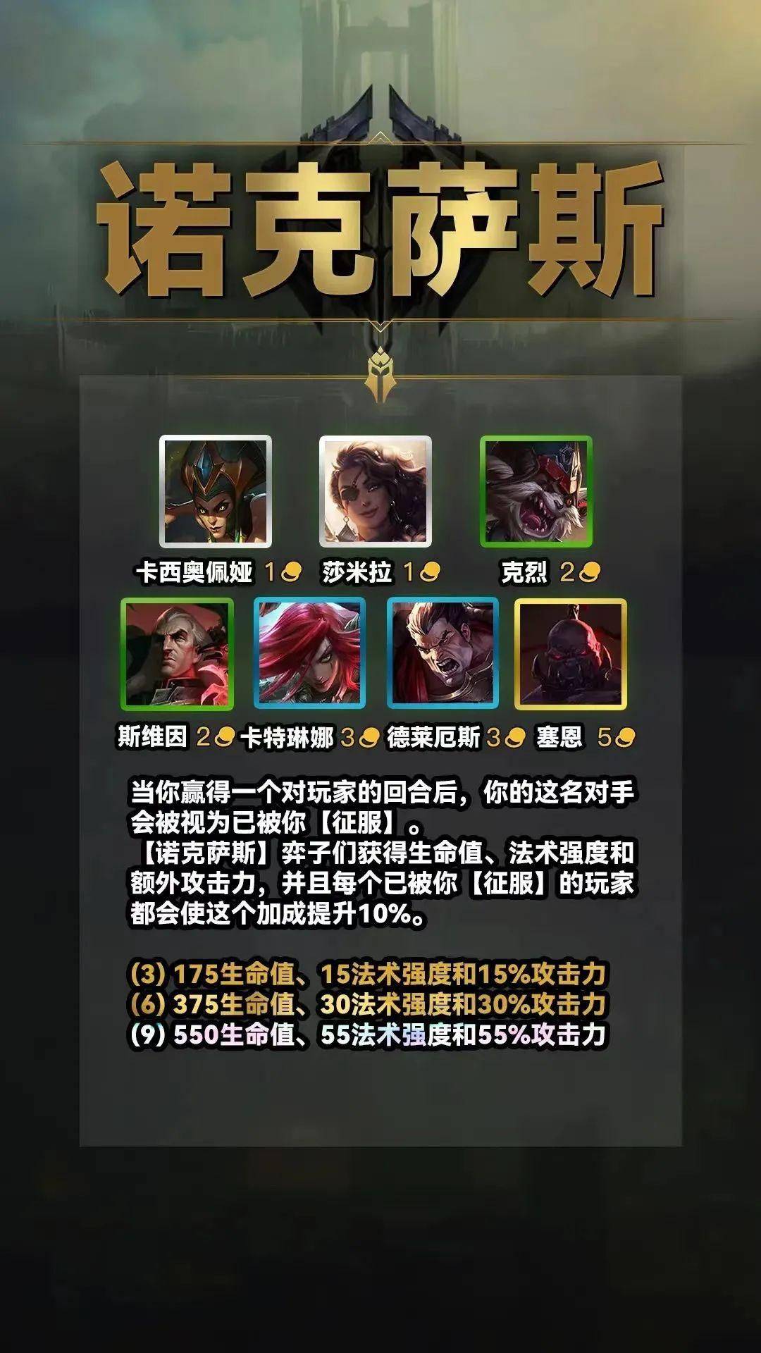 诺克萨斯英雄获得160/280/420额外生命值,16/28/42法术强度,16/28/42%攻击力。这个效果会在你战胜一个不同区域的对手时提高10%,最多提高70%。