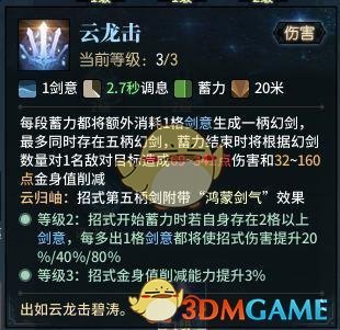 伤害占比第二的技能。每一次云龙击都要保证满剑意的情况再去使用。用来泄剑意打伤害的技能。目前急速较低。收益不大。