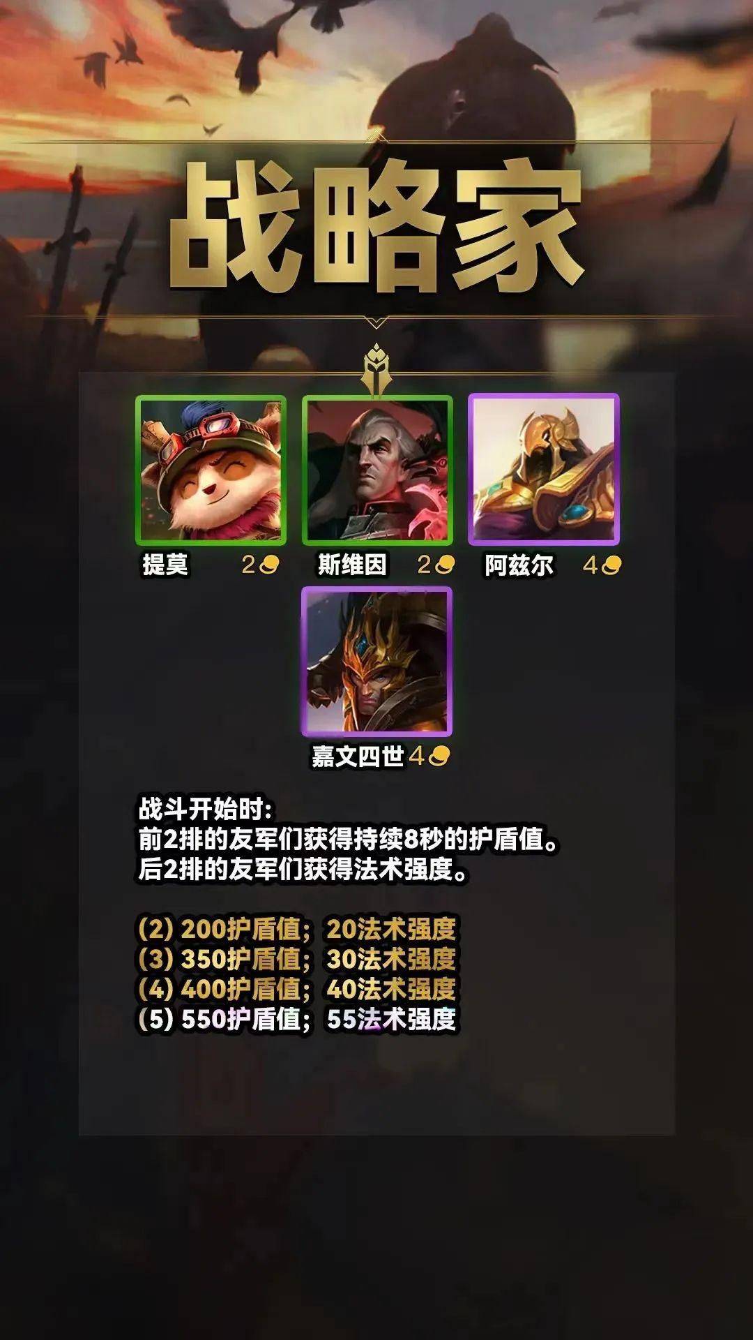 云顶之弈s9战略家分别是:斯维因,提莫,阿兹尔,嘉文四世,战斗开始时,前2排的友军获得200/350/400/550护盾,持续8秒。后2排的友军获得20/30/40/55法术强度。