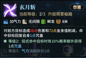玄月斩,咒隐的右键攻击技能,同样分为三段。消耗气力,是咒隐回复咒蛊(回豆)的主要手段之一。也是对冥烟斩进行卡刀的主力军,视情况左右左或者左左右都可以。