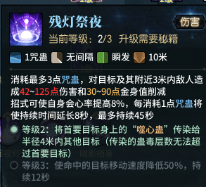 不管是该BUFF本身带的会心加成,还是通过星蕴特技获取的特殊效果都让这个技能变得很重要,群怪的时候更是必不可少。虽然每层咒蛊增加的时间是8秒,但它的叠加上限是45S,在续残灯祭夜时间的时候完全不需要等到它之前的时间结束,看时间条不多了直接续就行,不会浪费的。
