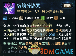 裂魄分影咒,咒隐特色技能,具有回溯各种状态的效果。通过裂魄分影咒可以让我们获得双份的技能,双份的资源,等等。但也有很多东西是没法回溯的,比如说剑技能,比如说残灯祭夜的状态等等。再就是施放裂魄分影咒之前已经进入CD的技能,在照月归影诀回去以后,它会继续正常走CD,而不是回到施放裂魄分影咒之前的状态,这点大家可以放心。比如说A技能已经进入CD,还有40S恢复,此时进入裂魄分影咒,13S后照月归影诀,A技能的CD会是差27S恢复好的状态,并不会回到之前40S的状态。