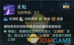 止厄,解控技能。施放的时候会向后退,这点需要注意一下,别刚解控一个后退又被控上了。2级止厄施放后可以进入隐身,因此PVE中可以视情况一并加入到我们的输出循环中来。当然是要视情况,个别情况还是要留一下的。